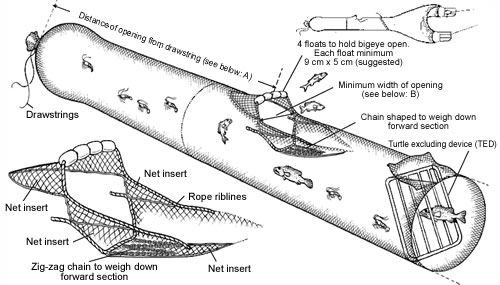 - During trawling the opening has a weighted forward section and a buoyed rear section with at least two 50mm by 90mm floats attached.
